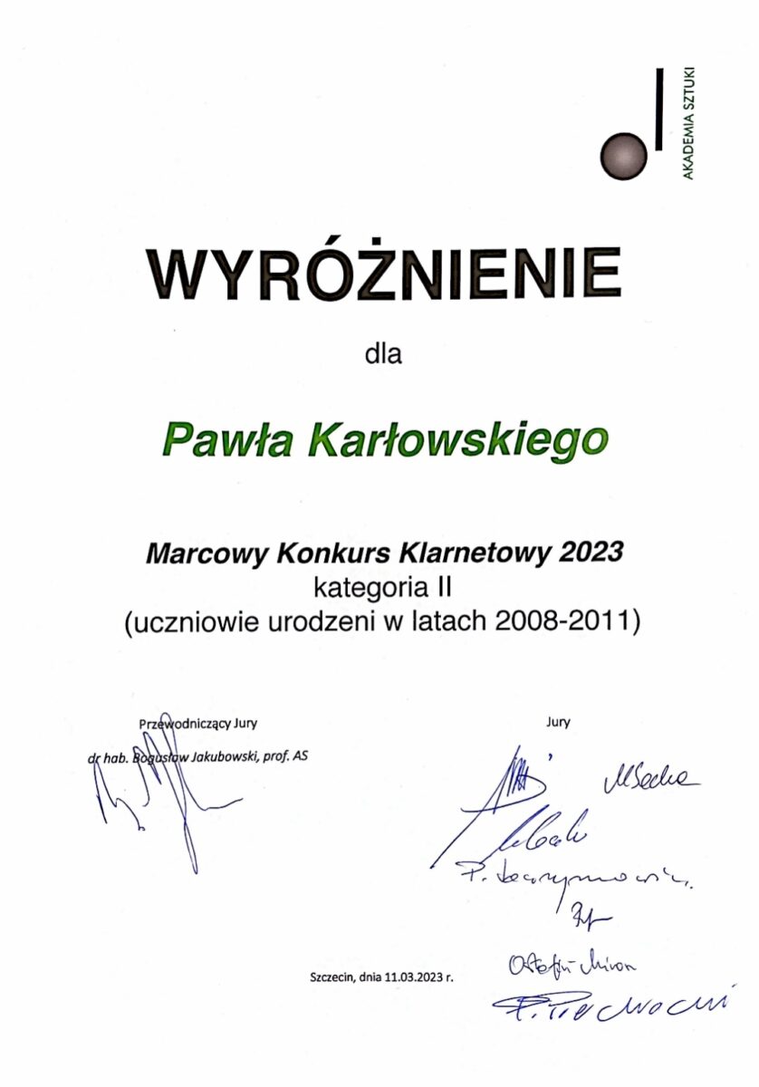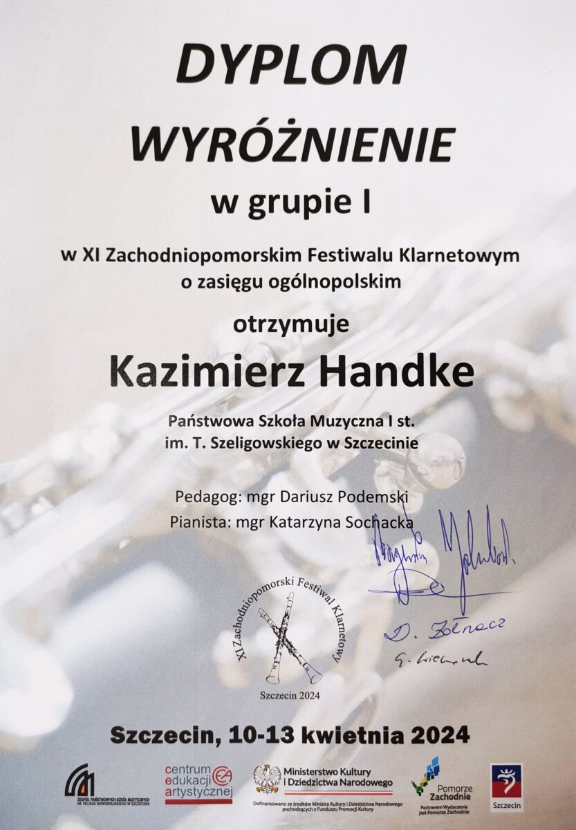 XI Zachodniopomorski Festiwal Klarnetowy, 10-13.04.2024 Szczecin – wyróżnienie