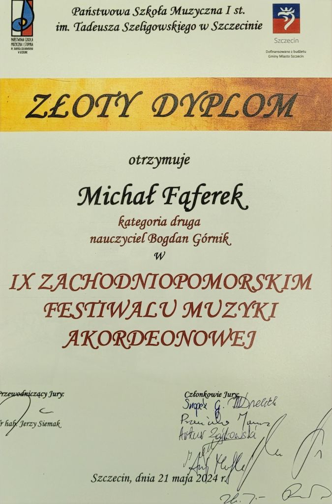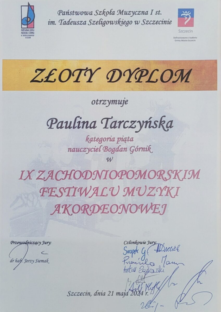 IX Zachodniopomorski Festiwal Muzyki Akordeonowej w Szczecinie, 21.05.2024 r. – złoty dyplom