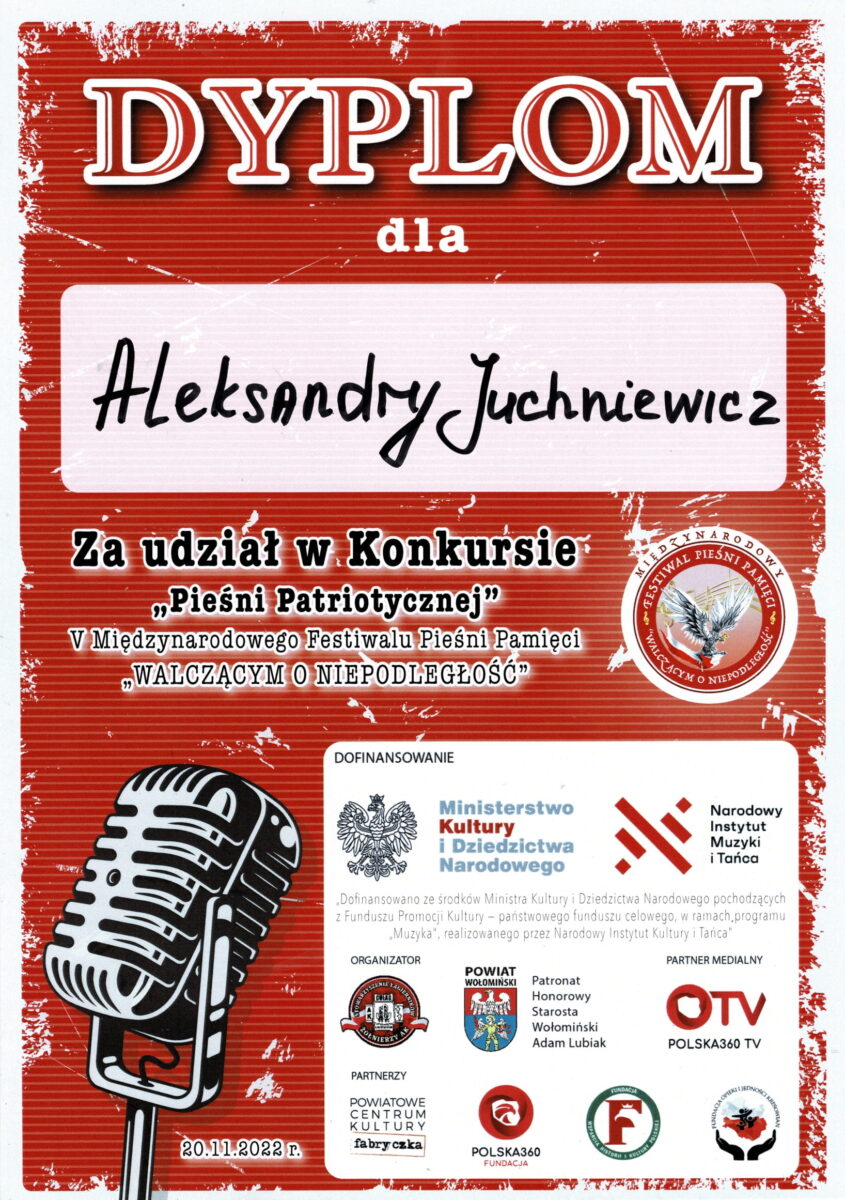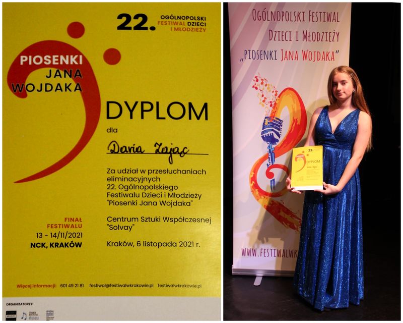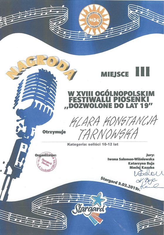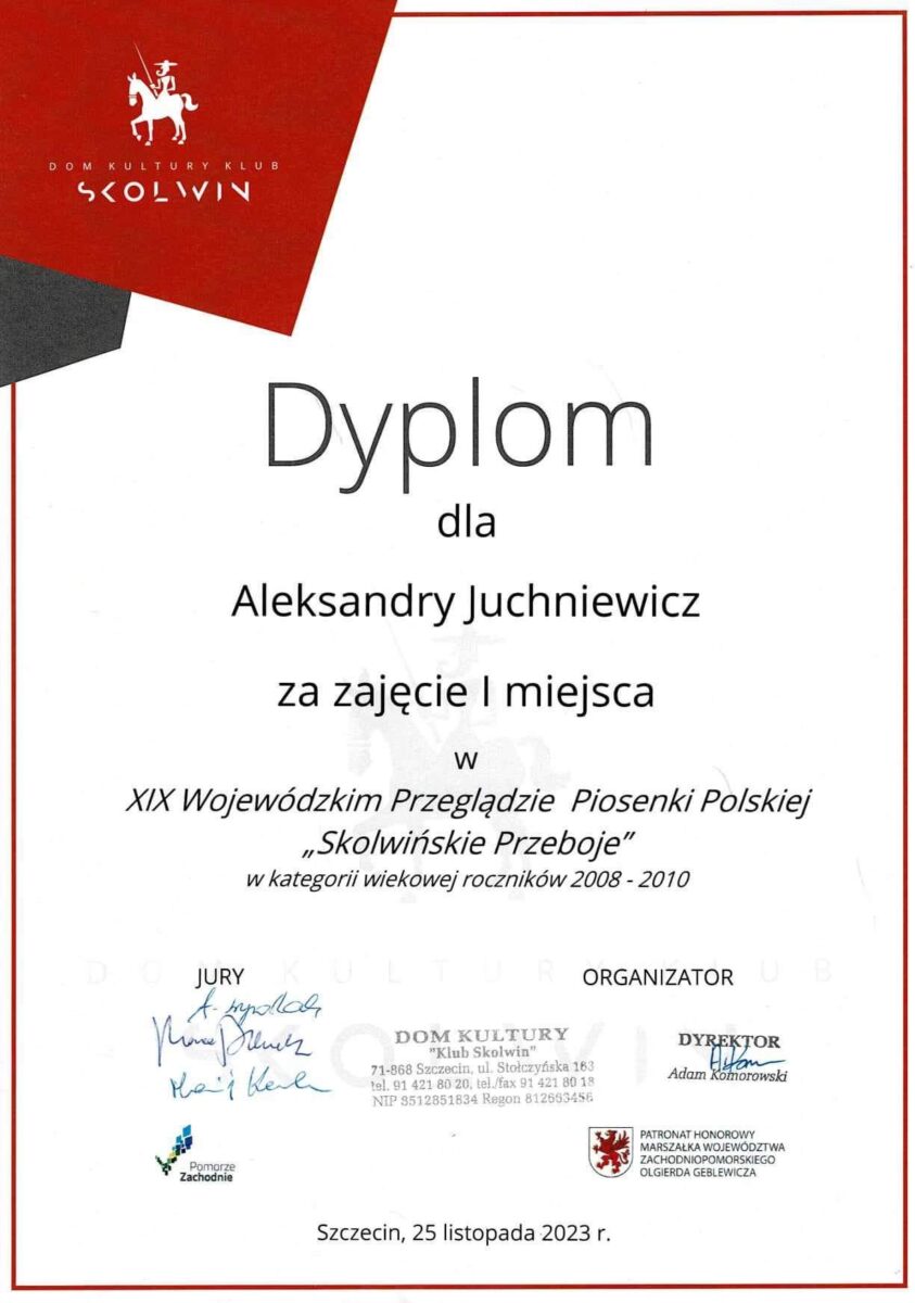XVII Wojewódzki Przegląd Piosenki Polskiej „Skolwińskie Przeboje” w kategorii wiekowej roczników 2012-2015, 20.11.2021 Szczecin – III Miejsce