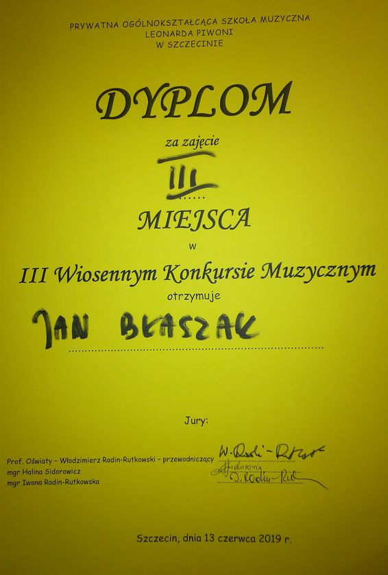 Szkolny Konkurs Pianistyczny „Jednego Utworu” – Szczecin 27.03.2018r. – III miejsce (kl. III/6)