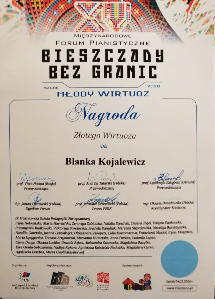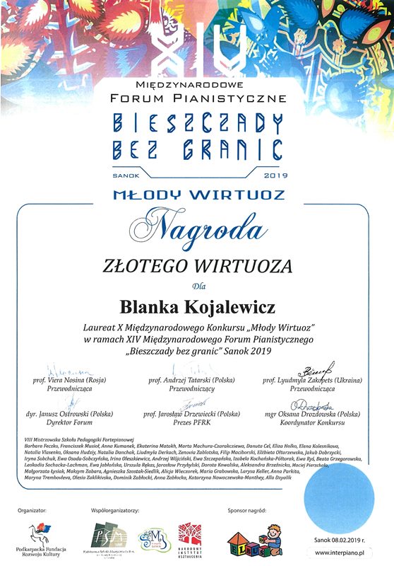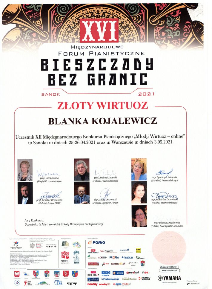 XII Międzynarodowy Konkurs Pianistyczny „Młody Wirtuoz – online”, 25-26.04.2021 Sanok – Złoty Wirtuoz