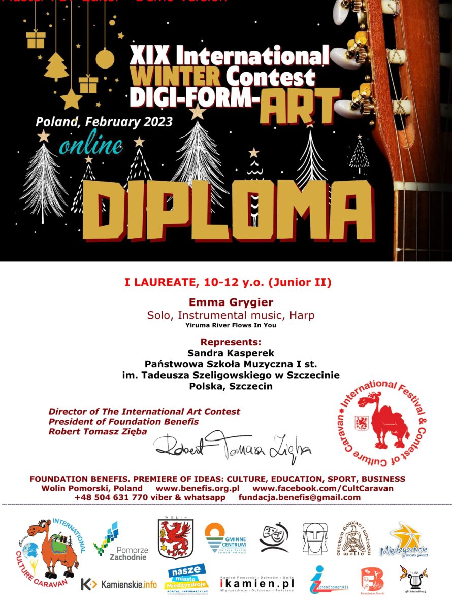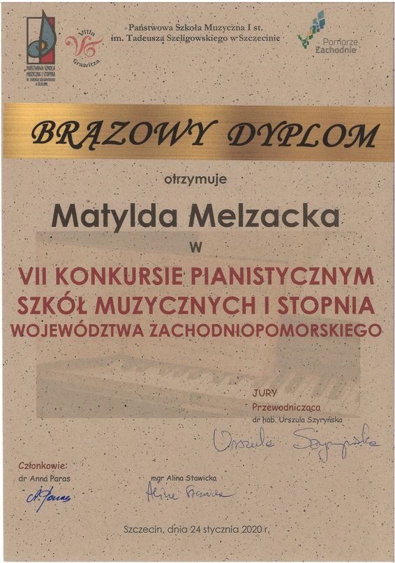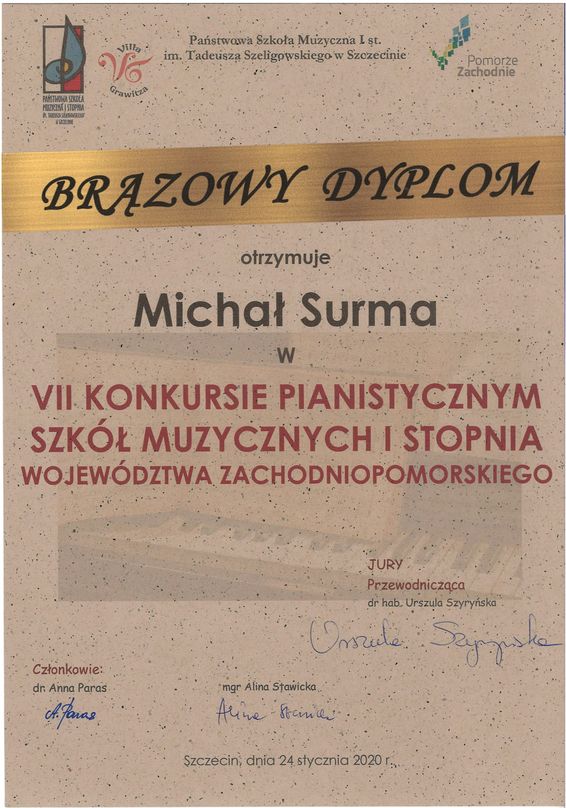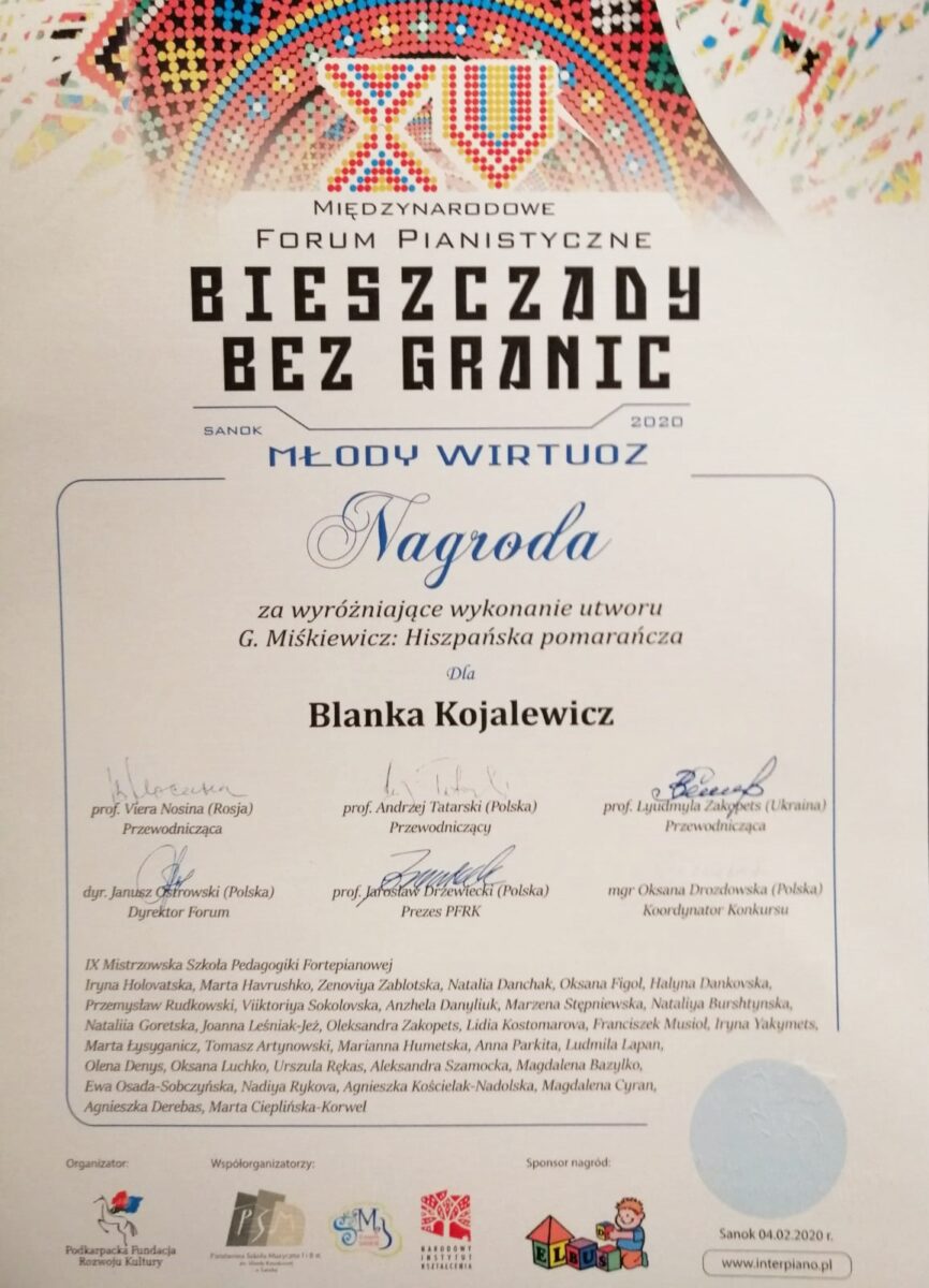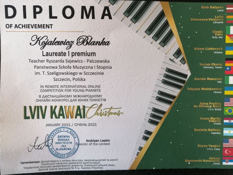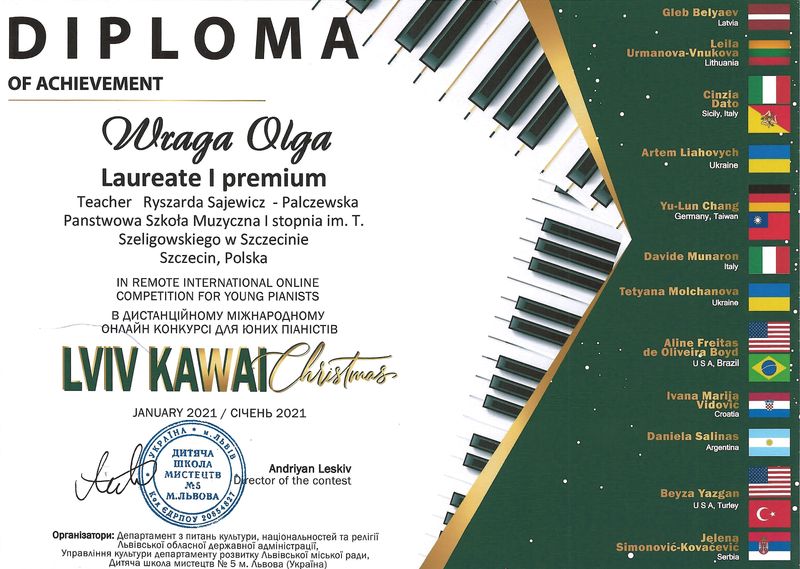 IN REMOTE INTERNATIONAL ONLINE COMPETITION FOR YOUNG PIANISTS, Styczeń 2021 Lwów – I Miejsce
