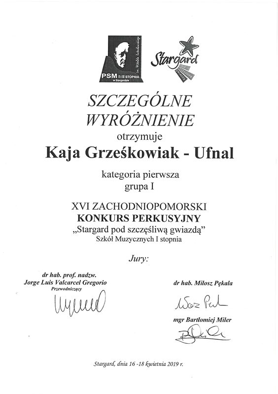 VI Międzywojewódzki Konkurs Skrzypcowy w Pyrzycach, 28 marca 2018 – wyróżnienie II stopnia w I grupie