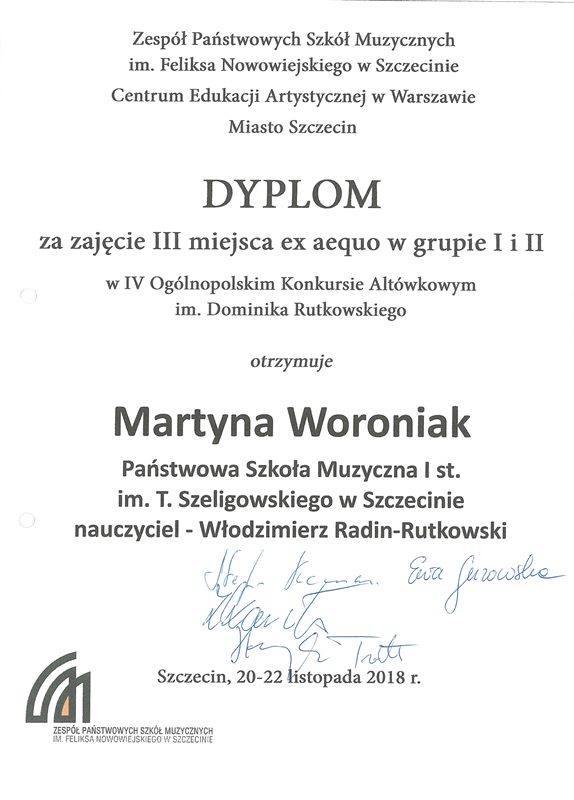 VII Międzyregionalny Konkurs Fletowy w Gorzowie Wielkopolskim, 16 maja 2018 – III miejsce