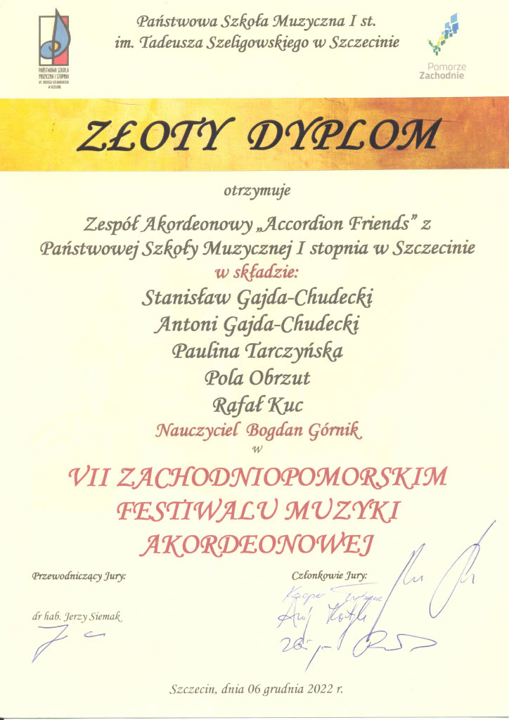 VII Zachodniopomorski Festiwal Muzyki Akordeonowej , 06.12.2022 Szczecin – Złoty Dyplom