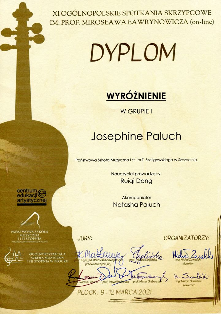 XI Ogólnopolskie Spotkania Skrzypcowe im. prof. Mirosława Ławrynowicza, 9-12.03.2021 Płock – Wyróżnienie